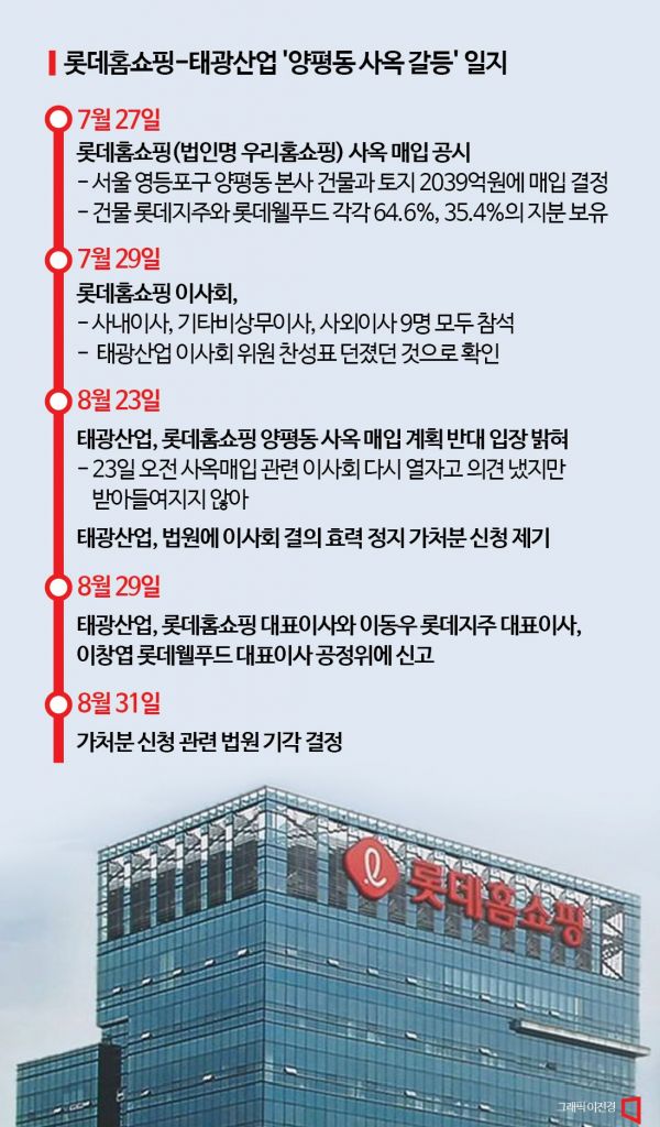 5일 아시아경제 취재를 종합하면 롯데홈쇼핑은 지난 1일 서울시 영등포구 양평동 사옥 매입과 관련해 롯데지주(지분 64.6%)와 롯데웰푸드(35.4%)에 잔금 납부와 건물 등기를 모두 끝마쳤다. 2010년 해당 건물에 발을 들인지 10여년 만에 주인이 된 것이다. 이는 7월 29일 이사회에서 태광산업 측 인사를 포함한 9명의 이사의 만장일치 결정에 따른 것이다. 태광산업은 1대 주주인 롯데홈쇼핑(53.49%)에 이은 2대 주주(44.89%)로 이사회에 기타비상무이사 3명을 두고 있다.