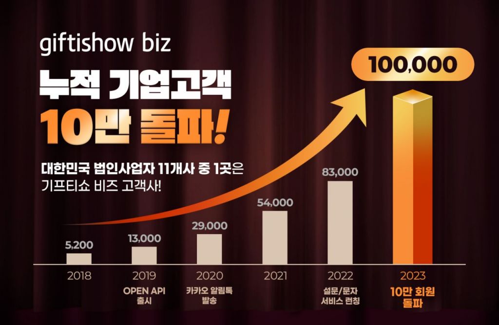 KT알파는 기업 전용 모바일 쿠폰 대량발송 서비스인 기프티쇼 비즈 기업 회원 수가 10만을 돌파했다고 5일 밝혔다. 국내 법인사업자 수는 약 110만(2022년 국세청 자료 기준)이다. 11개의 기업 중 1개 기업이 기프티쇼 비즈를 이용하는 셈이다.