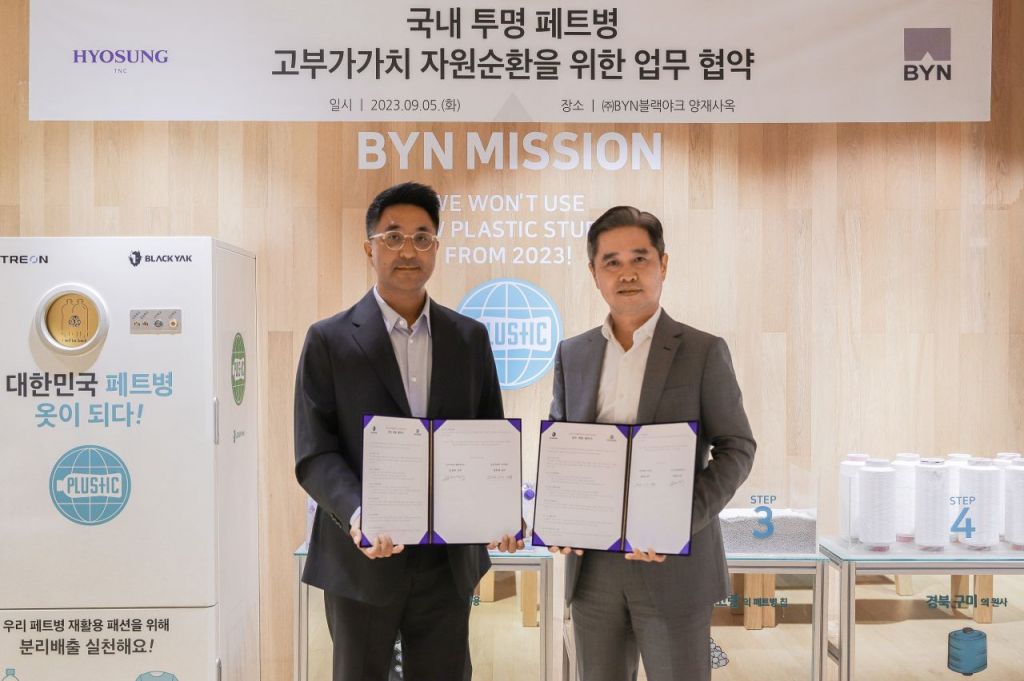 효성티앤씨는 비와이엔블랙야크와 서울 서초구 블랙야크 본사에서 환경보호 실천을 위한 ‘무색 폐페트병 자원선순환 시스템 확대 업무협약식’을 열었다고 6일 밝혔다.
