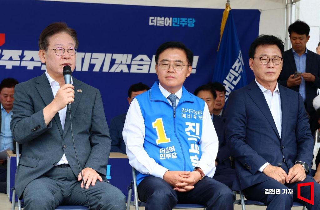 이재명 더불어민주당 대표가 6일 국회 본관앞 단식농성천막에서 열린 진교훈 서울 강서구청장 보궐선거 후보자에 대한 공천장 수여식에서 인사말을 하고 있다. 사진=김현민 기자 kimhyun81@