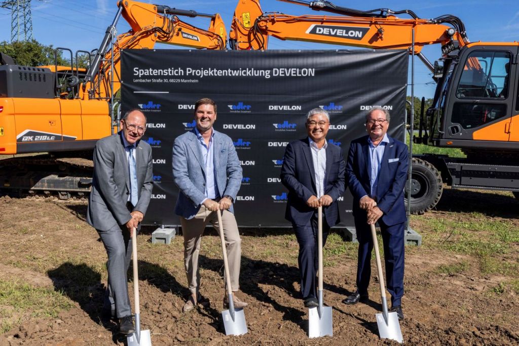 HD현대인프라코어가 5일(현지시각) 독일 만하임에서 디벨론(DEVELON) 건설기계 독일 법인 'HD Hyundai Infracore Deutschland' 기공식을 개최했다. (왼쪽부터) 만하임 크리스티안 슈페히트 최고 시장, 아들러 그룹 알렉산더 아들러 대표이사, HD현대인프라코어 오승현 대표이사, 아들러 그룹 요한 아들러 이사.