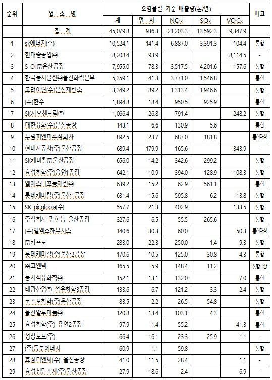 울산시는 협약 이행 기간이 지난해 말 끝남에 따라 이행평가를 위해 참여 기업체의 대기오염물질 배출량을 분석했다.