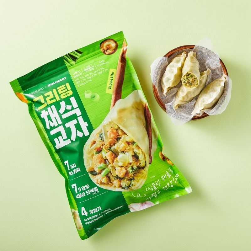 그리팅 채식교자에 사용된 대체육은 콩에서 추출한 '조직식물단백(TVP)' 2종을 혼합해 식감을 살렸고, 국산 마늘·생강·부추·양파 등 7가지 채소를 사용해 콩고기 특유의 풋내를 최소화했다. 만두피의 경우, 반죽의 기포를 제거해 탄성을 극대화하는 '진공 배합' 과정을 통해 조리 후에도 쫄깃한 식감을 유지하는 것이 특징이다. 또 영하 35도 이하에서 급속 냉동해 조리 후에도 식재료 본연의 맛을 느낄 수 있다고 회사 측은 설명했다.