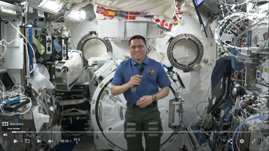 미 NASA 우주조종사 프랭크 루비오가 지난 12일(현지 시각) 국제우주정거장(ISS)에서 인터뷰를 하고 있다. 사진출처=NASA 유튜브 채널 캡처