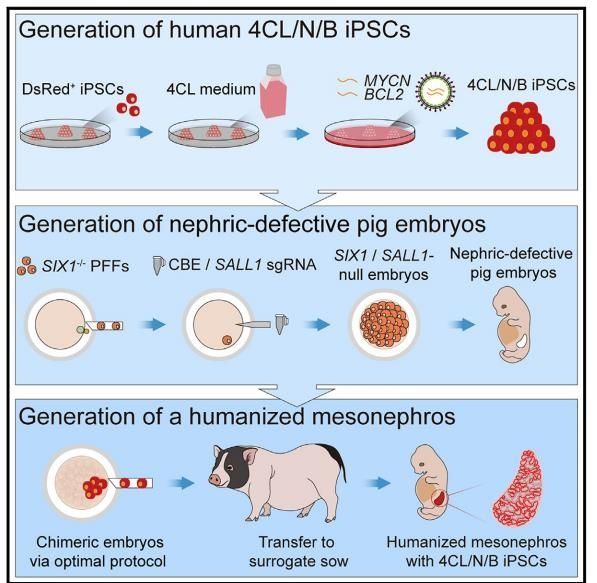 한편 중국과학원(CAS) 광저우 바이오의학보건연구원(GIBH) 량쉐 박사팀은 지난 7일 과학저널 '셀 스템 셀'(Cell Stem Cell)에 "인간과 돼지 키메라 배아를 만든 뒤 대리모 돼지에 이식하고 28일간 키워 인간화된 신장이 정상적인 구조와 세뇨관을 형성하는 것을 확인했다"고 밝혔다. 그동안 인간 혈액이나 골격근 같은 조직을 돼지 몸속에서 만든 적이 있지만 다른 종의 몸속에서 인간화 고형 장기를 성장시킨 것은 이번이 처음이다.