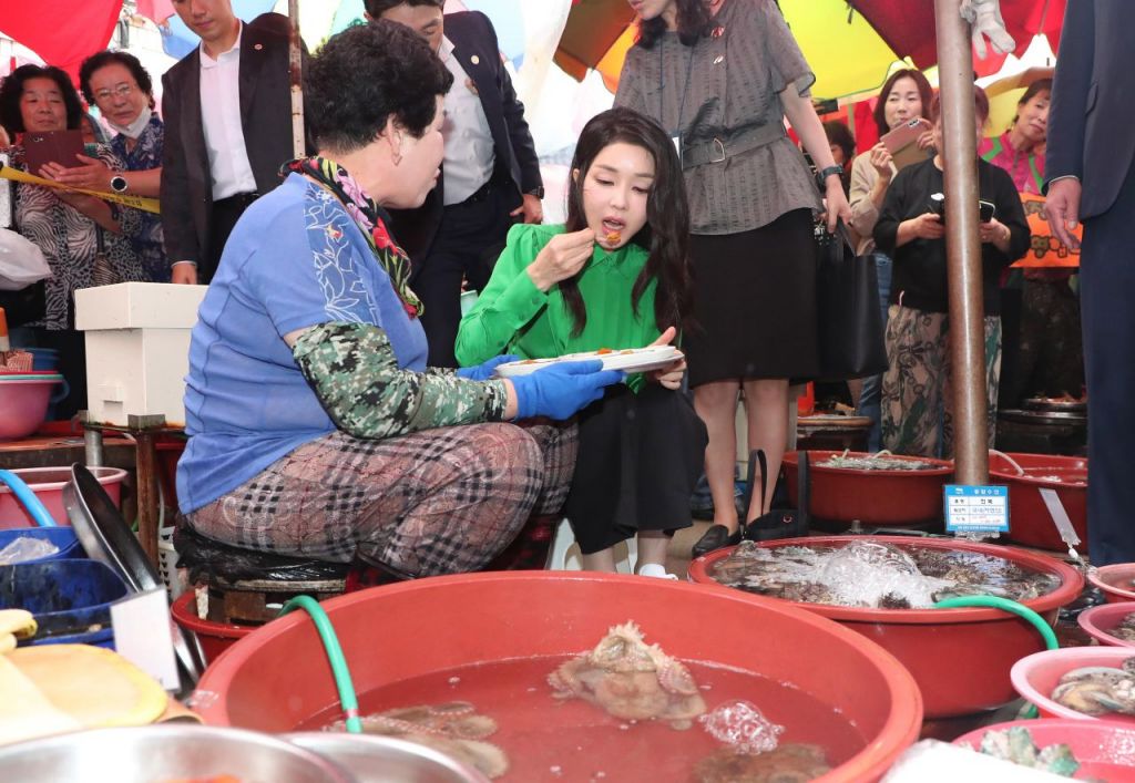 윤석열 대통령 부인 김건희 여사가 14일 부산 기장시장을 찾아 성게를 맛보고 있다. [이미지출처=연합뉴스]