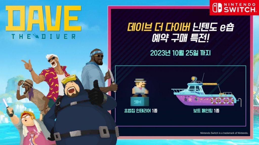 넥슨은 오늘부터 출시 전까지 ‘데이브’ 스위치 버전의 사전 예약 판매를 실시한다. 예약 구매한 유저 한정으로 ‘보트 페인팅’ 및 ‘초밥집 인테리어’를 특전 혜택으로 제공할 예정이다. 뿐만 아니라 현재 닌텐도에서 무료 체험판으로 플레이가 가능하며, 정식 출시 후 이어서 플레이할 수 있도록 데이터 세이브 기능을 제공한다.
