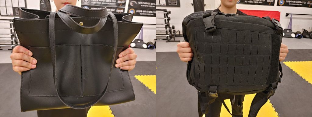 1. 토트백(여성용 대형 손가방)이나 가방 입구가 위로 가도록 하고 양손으로 힘껏 움켜잡는다. 상대의 흉기 공격 시 충격으로 가방이 손에서 이탈하는 것을 막기 위해서다. 손가락으로 강하게 움켜잡는 게 포인트다.