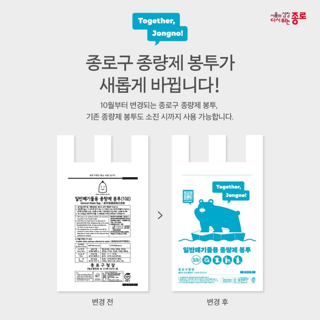종로구(구청장 정문헌)가 1995년 쓰레기 종량제 전면 시행 이후 28년 만에 처음으로 오는 10월 1일 새로운 디자인을 도입한 종량제 봉투를 판매한다.