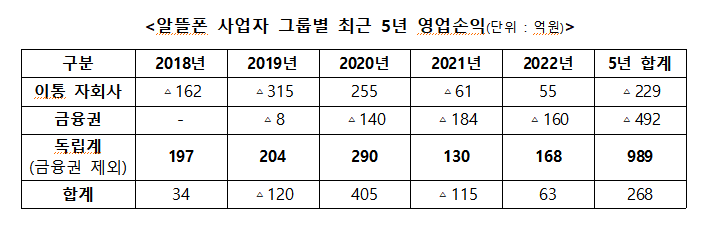 최근 5년 간 이통3사 자회사 알뜰폰 5개사의 누적 영업손실은 229억원이며, KB의 누적 영업손실은 무려 492억원에 달한다. 6개 사업자의 영업손실이 700억원을 넘어서는 규모다. 다시 말해 같은 기간 이들 6개사를 제외한 일반 독립계 알뜰폰 사업자의 영업이익은 1000억원에 달하는 셈이다.