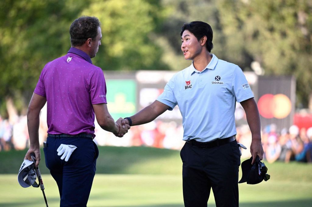 김성현(오른쪽)과 저스틴 토머스가 ‘가을 시리즈’ 포티넷 챔피언십 4라운드를 마친 뒤 악수하고 있다.[내파(미국)=AFP·연합뉴스]