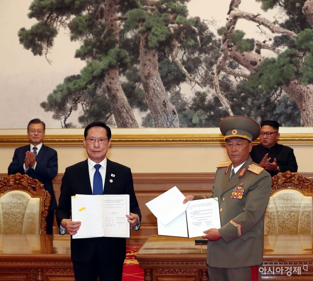 2018년 9월 문재인대통령과 김정은 국무위원장이 참석한 가운데 평양 백화원 영빈관에서 군사합의문서명식이 열리고 있다. 송영무 국방부 장관과 노광철 인민무력상이 군사 분야 합의문 서명식울 마치고 기념촬영하고 있다./평양사진공동취재단