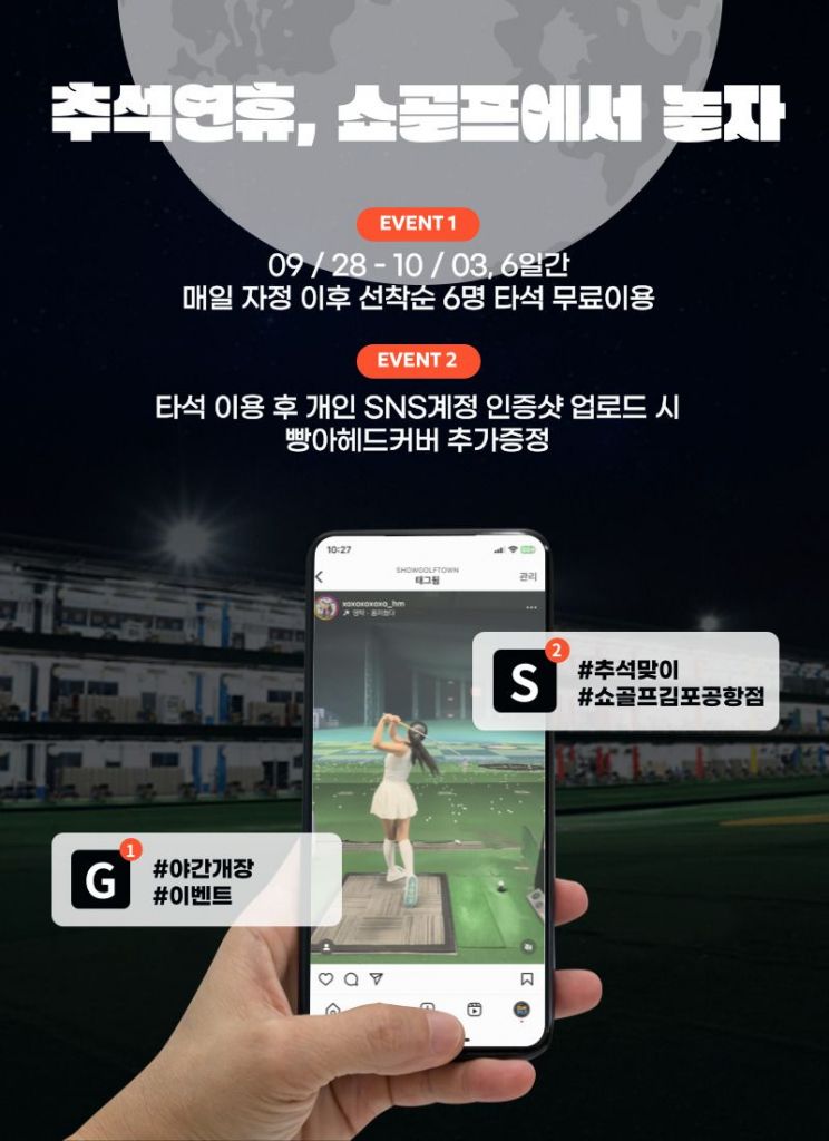 쇼골프 김포공항점은 이와 함께 추석을 맞아 심야 이벤트도 진행한다. 우선 오는 28일부터 10월3일까지 매일 자정 이후 방문한 선착순 6명에게 타석을 무료로 제공한다. 또 선착순 안에 포함된 이용객은 타석 이용 후기를 본인 사회관계망서비스(SNS)에 업로드하면 '빵아 헤드커버'를 추가로 받을 수 있다.
