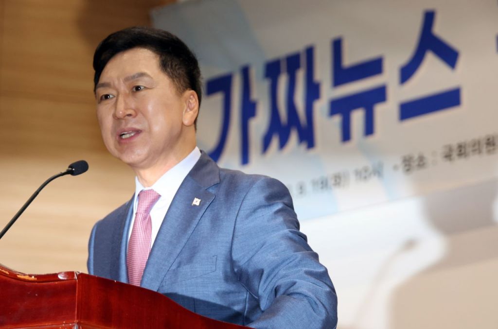 김기현 국민의힘 대표가 19일 국회에서 열린 가짜뉴스 근절 입법청원 긴급공청회에서 인사말을 하고 있다. [이미지출처=연합뉴스]