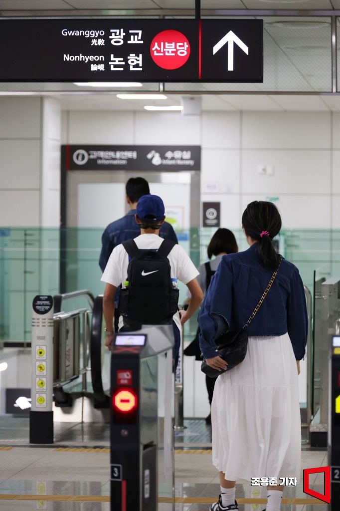 서울 강남과 경기도 판교, 광교를 운행하는 신분당선이 내달 7일부터 최대 450원(교통카드기준) 요금인상을 예고한 21일 서울 서초구 신분당선 신사역을 시민들이 이용하고 있다. 이번 인상으로 노선의 종점인 광교역에서 신사역까지 편도로 이용할 경우 4100원을 내야한다. 사진=조용준 기자 jun21@