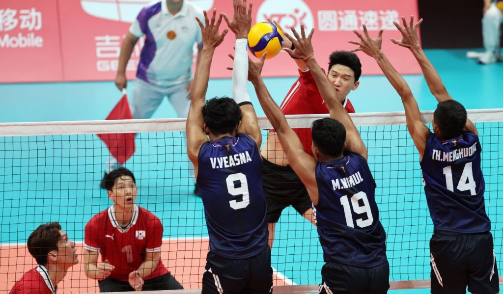 이날 코트는 중앙에 미들 블로커 김민재와 김규민, 리베로는 박경민이 맡았다. 공격에는 허수봉과 나경복이 출전했다. 전날 허리 통증으로 결장했던 정지석도 힘을 보탰다. 다만 한국 대표팀은 아마추어 수준으로 간주되는 캄보디아를 상대로 원활하지 못한 경기 초반 흐름을 보였다.
