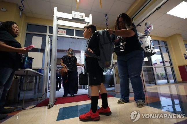 텍사스의 한 초등학교에서 학생들이 등교하며 소지품 검사를 받고 있다 [이미지출처=연합뉴스]