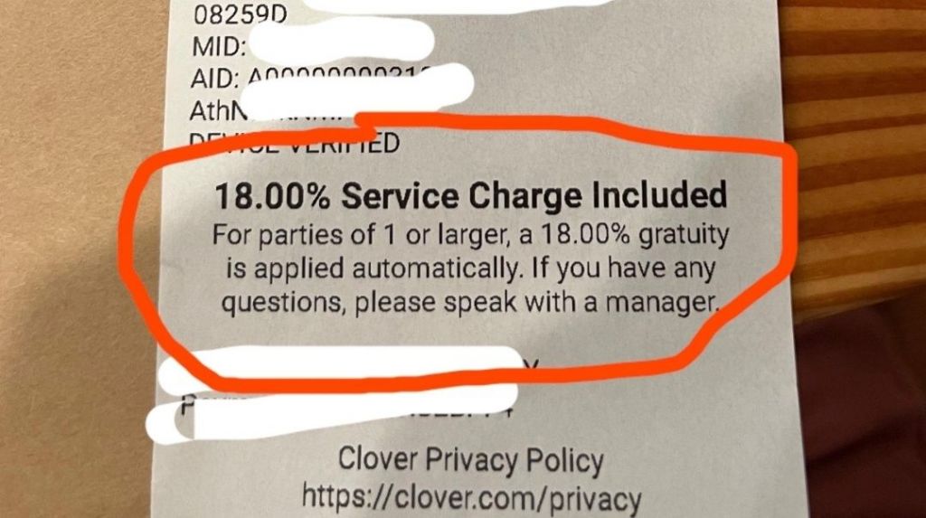 18% 팁이 자동 부과된다는 내용이 명시된 미국의 한 식당 영수증[이미지출처=레딧 캡처]