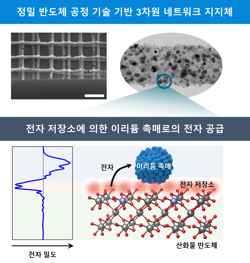 연구팀은 초미세 패턴을 적층해 3차원 네트워크 구조를 구현할 수 있는 반도체 기술을 활용했다. 이때 사용한 물질은 안티모니(Sb)가 도핑된 주석 산화물이며, 이 산화물 표면에는 ‘전자 저장소’역할을 하는 산소 이온이 고농도로 분포하도록 반도체 증착 기술을 적용하였다. 이 독특한 산화물 반도체를 촉매 지지체로 사용하게 되면 표면에 위치한 산소 이온이 이리듐(Ir) 촉매로 충분한 양의 전자를 지속적으로 보충해 줌으로써 촉매의 높은 수소 생산 효율을 장기간 유지해 주게 된다.