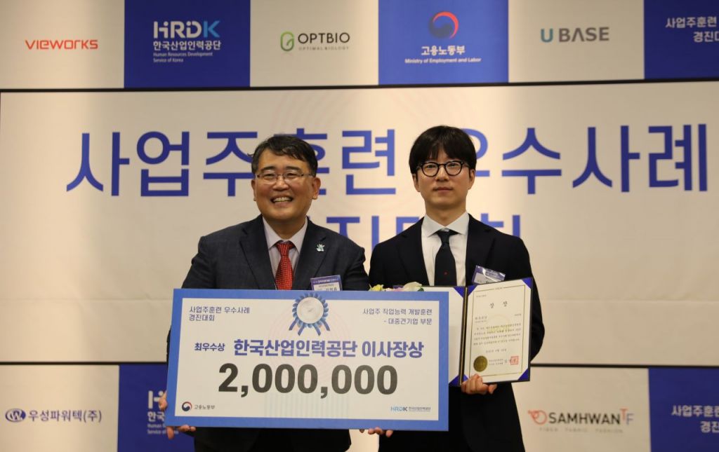 김영중 한국산업인력공단 이사장 직무대행(왼쪽)이 25일 서울 코엑스에서 열린 '2023년 사업주 직업능력개발훈련 우수사례 경진대회'에서 대·중견기업부문 최우수상을 수상한 한독의 최충남 팀장과 기념사진 촬영을 하고 있다.