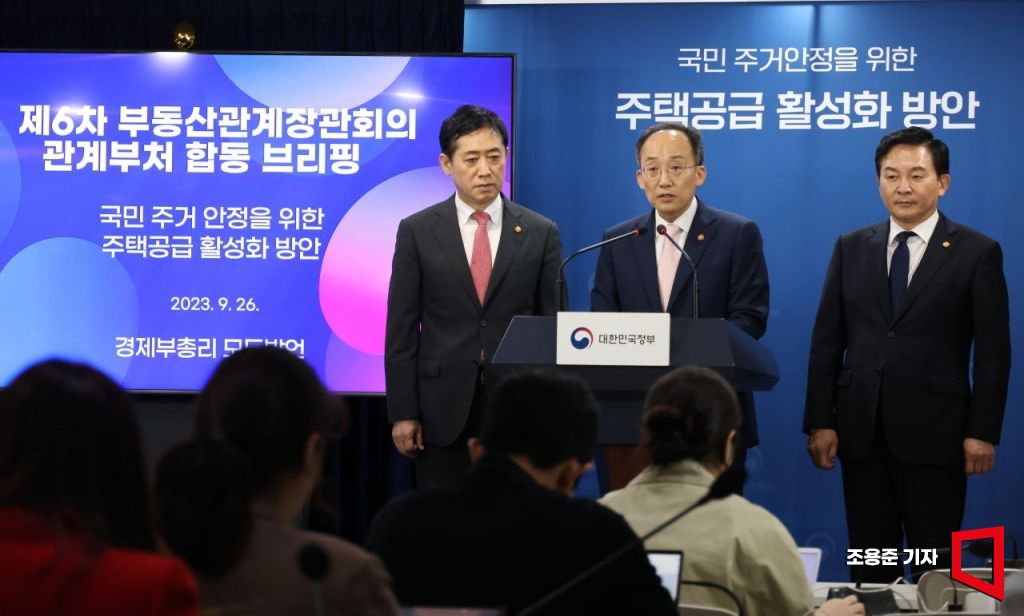추경호 부총리겸 기획재정부 장관, 원희룡 국토교통부장관, 김주현 금융위원장이 26일 서울 종로구 정부서울청사에서 '주택공급활성화 방안'을 발표하고 있다. 이번 주택공급 대책에는 3기 신도시 공급 일정을 앞당기고 물량도 일부 확대하는 방안을 담고 있다. 사진=조용준 기자 jun21@