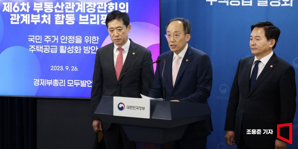 추경호 부총리겸 기획재정부 장관, 원희룡 국토교통부장관, 김주현 금융위원장이 26일 서울 종로구 정부서울청사에서 '주택공급활성화 방안'을 발표하고 있다. 사진=조용준 기자 jun21@