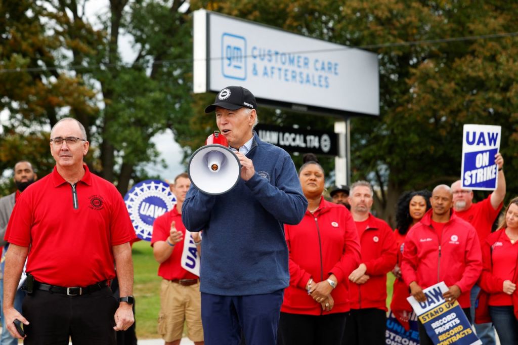 UAW 로고가 새겨진 검은 야구모자를 착용한 바이든 대통령은 이날 파업 중인 노조원들과 함께 피켓라인에 서서 메가폰을 들었다. 그는 "문제의 사실은 여러분, 즉 UAW가 2008년과 그 이전에 자동차 산업을 구했다는 것"이라며 "당신들은 많은 희생을 했고 많은 것을 포기했다. (당시) 회사는 어려움에 처해 있었다"고 말했다. 이어 "이제 그들(빅3)은 믿을 수 없을 정도로 잘하고 있고, 당신들도 그러하다"면서 "당신들은 상당한 임금 인상과 기타 혜택을 받을 자격이 있다"고 목소리를 높였다. 과거 회사의 경영난 당시 노동자들의 희생을 강조하면서 "잃은 것을 되찾자"고 임금 인상 등의 요구를 지지한 것이다.