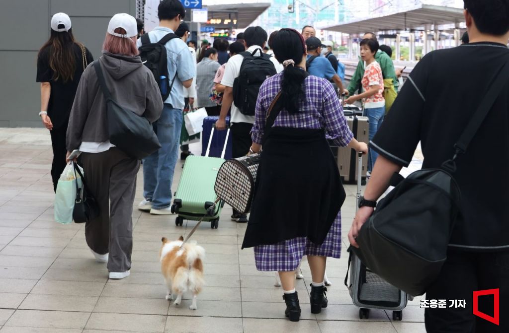 추석 연휴를 하루 앞둔 27일 오전 서울 중구 서울역에는 고향으로 향하는 귀성객이 애완견을 데리고 열차 탑승을 위해 이동하고 있다. 사진=조용준 기자 jun21@