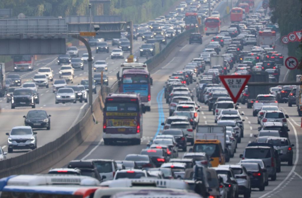 서울 경부고속도로 잠원 IC 인근 상(왼쪽)·하행선이 차량으로 붐비고 있다.[이미지출처=연합뉴스]