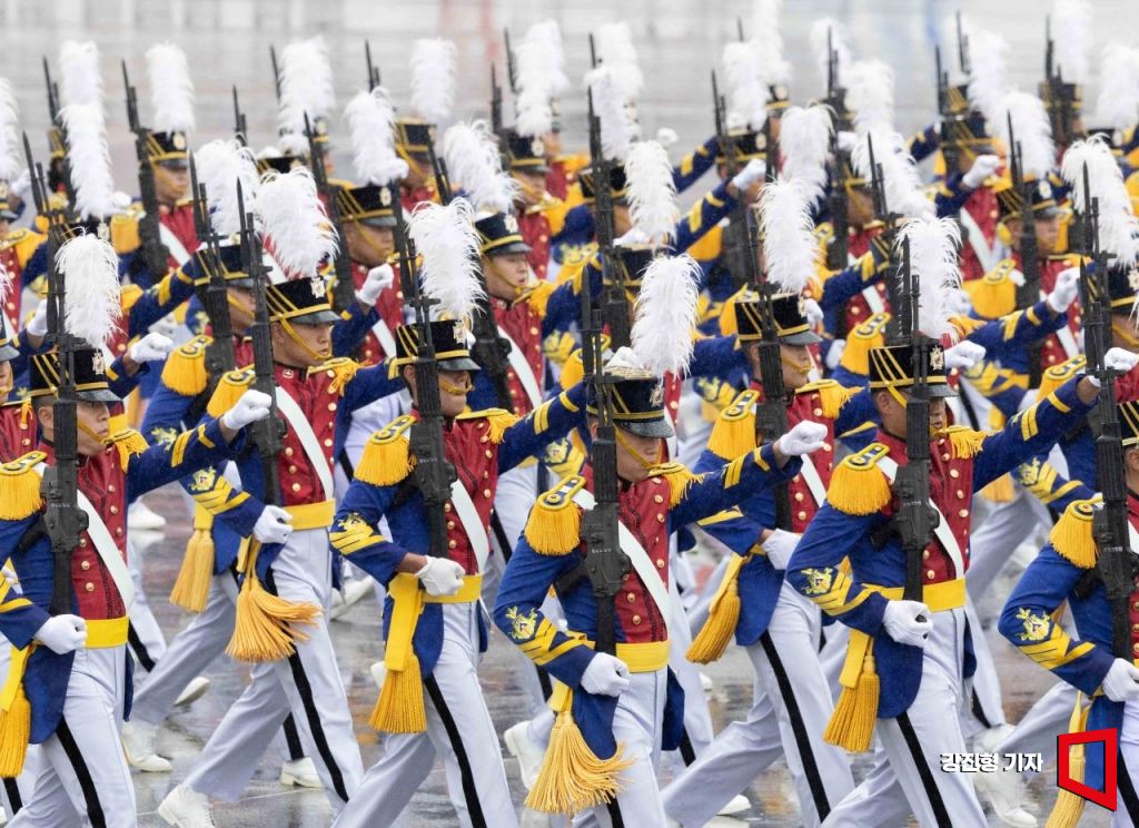 지난달 26일 오전 경기도 성남시 서울공항에서 열린 제75주년 국군의 날 기념식에서 육군사관학교 생도들이 분열을 하고 있다. 사진=사진공동취재단