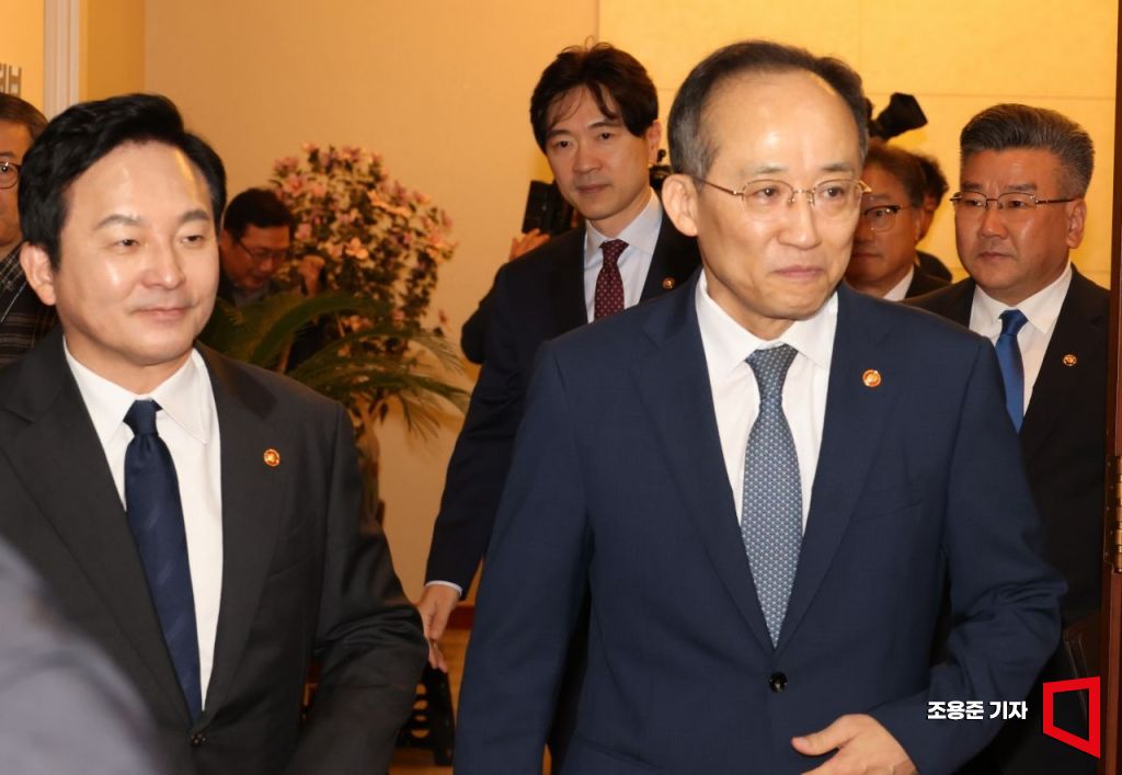 추경호 부총리 겸 기획재정부 장관과 원희룡 국토교통부 장관이 4일 서울 종로구 정부서울청사에서 열린 국무회의에 참석하고 있다. 사진=조용준 기자 jun21@