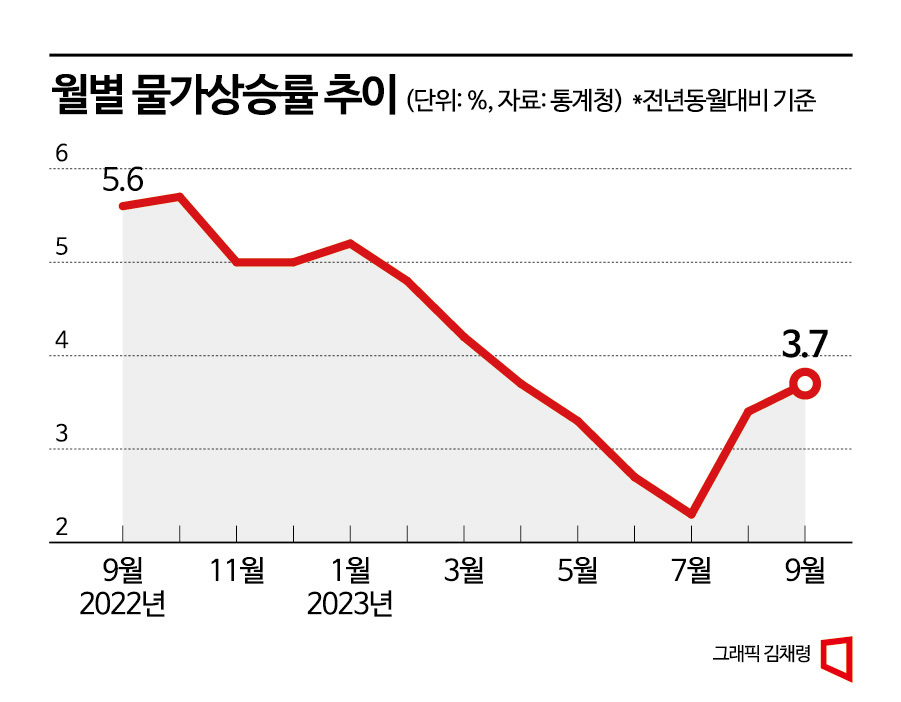 지난달 소비자물가가 지난해 같은 달보다 3.7% 올랐다. 5개월 만에 최대 상승 폭이다. 국제유가가 최근 급등한 데다 추석 연휴로 인해 농산물 가격이 크게 오른 탓이다. 정부는 수확기를 맞아 농산물 가격이 점차 안정되겠지만, 유가상승은 다음 달에도 물가에 영향을 미칠 것으로 전망했다.