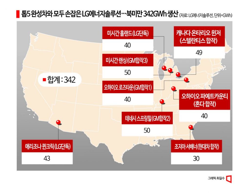 LG에너지솔루션은 현재 북미에서 2개의 단독 공장과 6개의 합작 공장을 운영 및 건설하고 있다. 도요타 공급으로 인한 증설량까지 더하면 2026년 이후 생산능력은 342GWh로 늘어난다. 전기차 약 410만대 분량의 배터리 생산이 가능해지는 것이다. 올해 6월 말 기준 LG에너지솔루션 누적 수주잔고는 440조원이다.