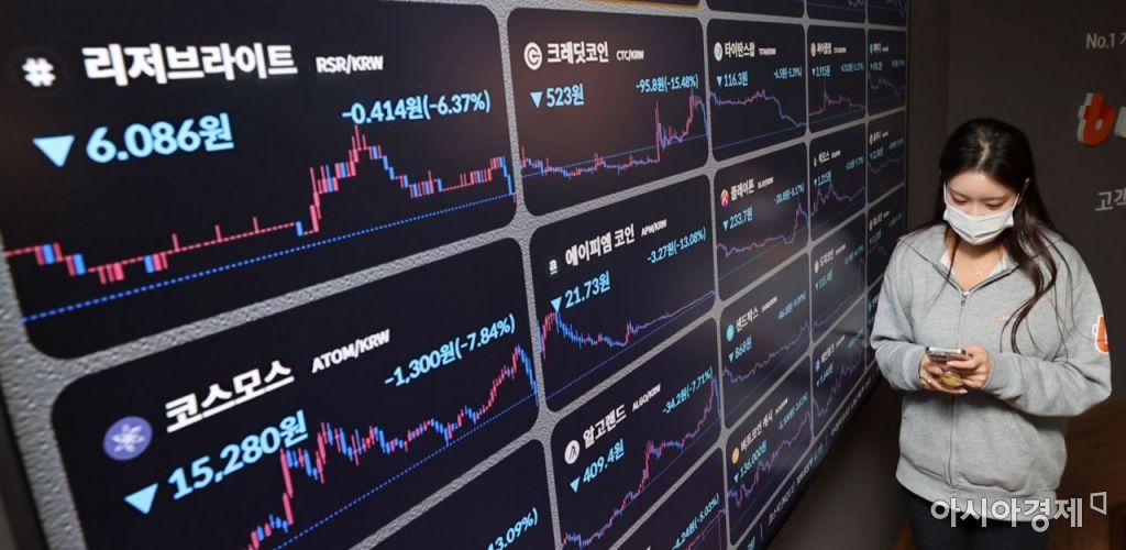 세계 2위 가상자산 거래소 FTX가 유동성 위기를 겪고 있다는 소식으로 뱅크 런(bank run, 대규모 예금인출 사태)이 발생하고 바이낸스의 인수 철회 소식까지 이어지며 비트코인이 12% 폭락하는 등 가상자산이 일제히 하락한 10일 서울 서초구 빗썸 고객지원센터 시세 전광판에 비트코인을 비롯한 주요 가상화폐 시세가 표시되고 있다./강진형 기자aymsdream@