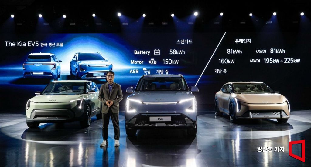 조상운 기아 글로벌 사업기획 사업부장이 12일 경기 여주 마임비전빌리지에서 열린 '2023 기아 EV Day'에서 EV5 한국 생산 모델을 공개하고 있다.