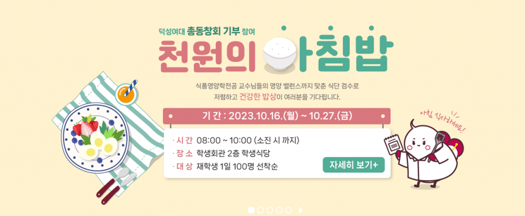 덕성여자대학교(총장 김건희)가 2학기 중간고사 기간 2주간 '천원의 아침밥'을 제공한다.