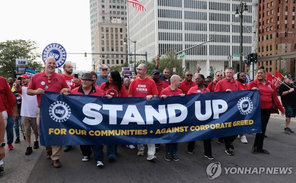 디트로이트 시내를 행진하는 UAW 소속 노조원들. [사진출처=로이터연합뉴스]