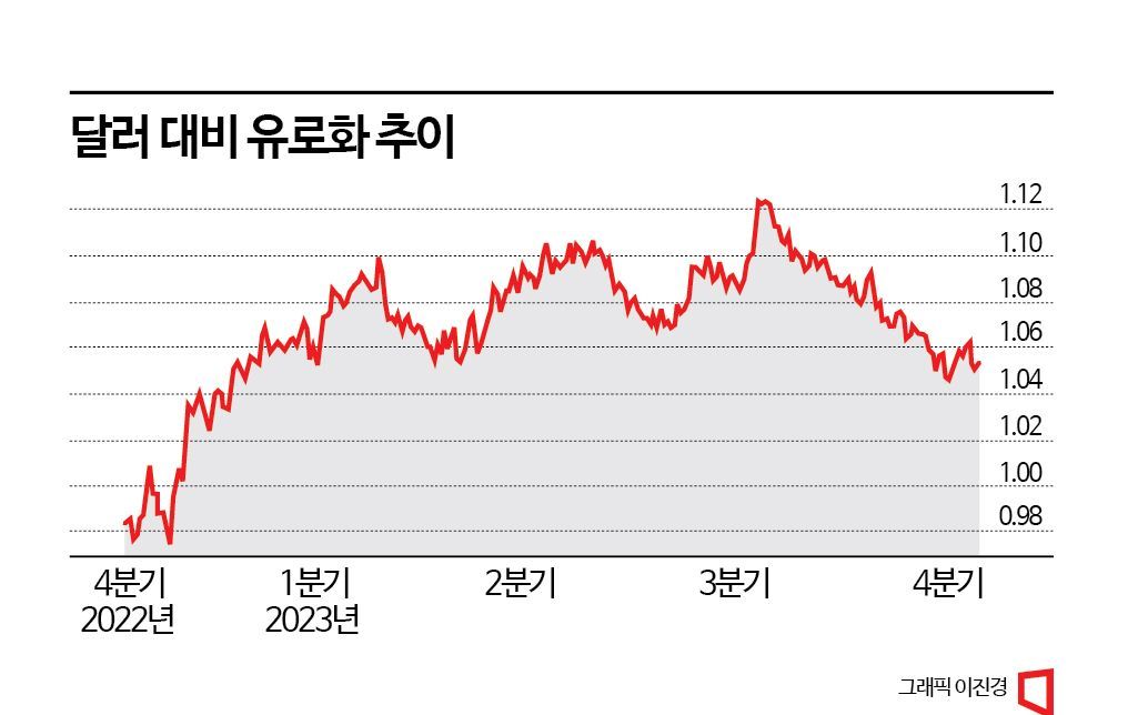 유럽 경기침체와 이스라엘·하마스 전쟁으로 인한 에너지 가격 상승이 유로화 가치를 떨어뜨릴 것이라는 전망이 나온다. 이에 따라 유로화 도입 20년 만인 지난해 처음 현실화된 유로·달러 '패리티(parity·1대1 교환)'가 연내 재연될 수 있다는 불안감이 커지고 있다.