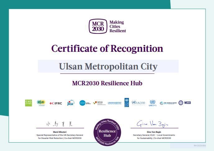 울산시는 유엔 재난위험경감사무국(UNDRR)으로부터 '재난복원력 중심도시'(Resilience Hub) 인증을 받았다. 세계 1612개 도시 가운데 26번째로 국내에서는 인천에 이어 2번째이다.