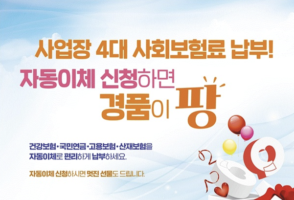 국민건강보험공단은 사업장 4대 사회보험료 자동이체 신청 확대 및 홍보를 위해 경품행사를 진행한다고 23일 밝혔다.