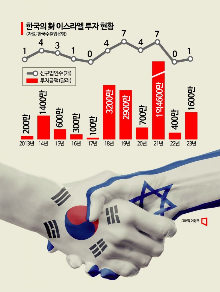 24일 한국수출입은행은 해외직접투자 통계에서 지난 10년간(2014~2023년 현재) 한국의 이스라엘 투자 규모가 2억5700만달러(약 3476억원)에 달한다고 밝혔다. 10년간 이스라엘에 우리 기업이 세운 신규 법인수만 31개에 달한다. 한국의 이스라엘 투자는 2004~2013년 1000만달러 수준(신규법인 9개)에 그쳤지만 이스라엘 기초원천기술과 우리나라 제조 산업기술을 기반으로 진행한 국제공동 연구개발(R&D) 성과가 기술개발을 넘어 사업화와 직접투자유치로까지 확장되면서 최근 10년간 급속도로 팽창했다. 이스라엘 투자 초기 제조업, 정보통신업에 국한됐던 업종도 금융·보험, 과학기술, 건설, 예술·스포츠 등 다양한 영역으로 확장된 상태다.