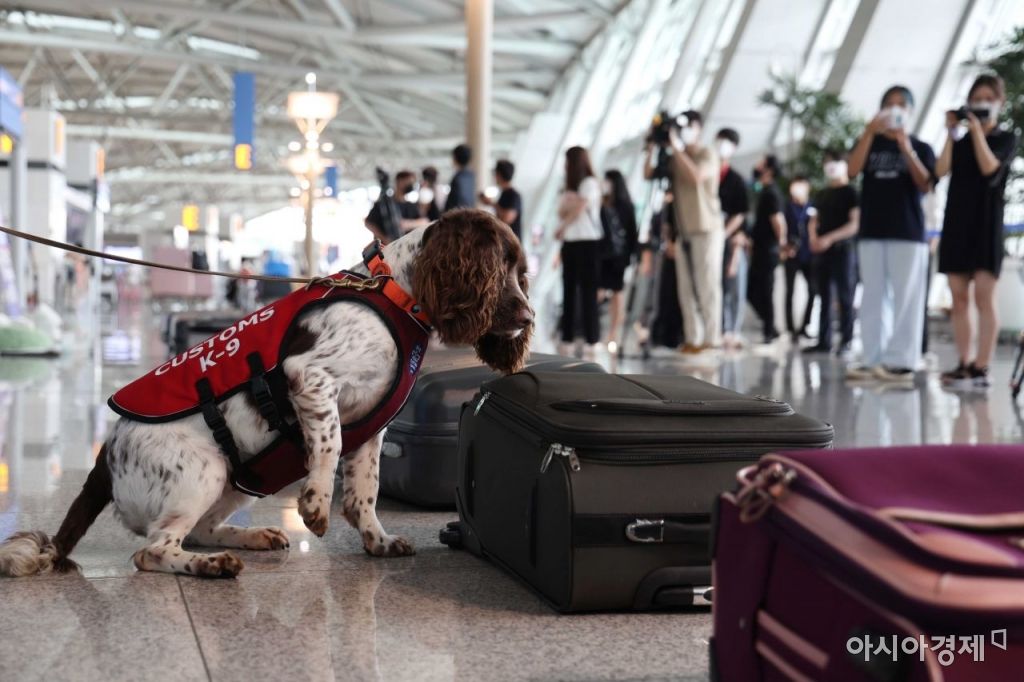 2022년 8월 11일 인천국제공항 제1여객터미널에서 열린 ‘관세청 마약류 밀반입 예방 캠페인’에서 마약 탐지견이 마약을 찾고 있다. /문호남 기자 munonam@