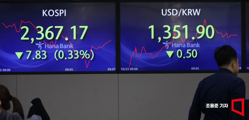 23일 서울 중구 하나은행 본점 딜링룸 현황판에 코스피와 원/달러 환율이 표시돼 있다. 코스피는 0.21% 하락한 2370.07 출발해 등락을 거듭했다. 사진=조용준 기자 jun21@
