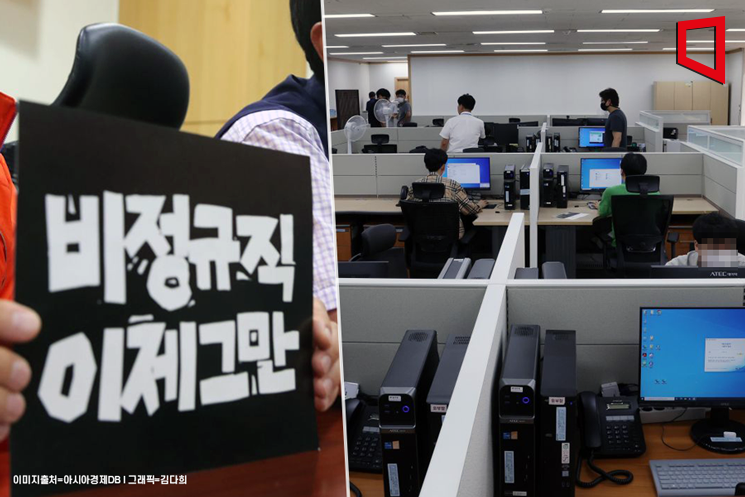 24일 통계청이 발표한 ‘근로형태별 부가조사 결과’에 따르면 비정규직 근로자는 812만2000명으로 전년동월대비 3만4000명 감소한 것으로 나타났다. 임금근로자 중 비정규직 근로자의 비중도 37.0%로 0.5%포인트 하락했다. 기획재정부 관계자는 “2021년도에 비정규직 규모가 38.4%로 피크를 찍은 뒤에 지속적으로 줄어들고 있다”면서 “특히 규모와 비중이 모두 줄어든 것은 처음”이라고 설명했다. 정규직 근로자는 1383만2000명으로 전년동월대비 26만4000명 증가했다.
