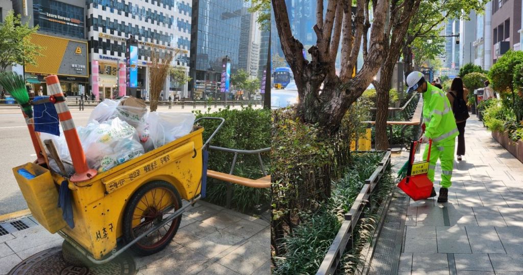 24일 오후 서울 지하철 2호선 강남역 앞에서 만난 박모씨(24)는 “영어학원을 다니고 있어서 강남에 자주 오는데 길가에 쓰레기통이 많이 없다”며 “버스를 타야 할 때는 굉장히 난감하다”고 하소연했다. 정모씨(30)는 “담배를 피우고 난 뒤에 버릴 곳이 마땅치가 않다”며 “솔직히 그냥 바닥에 버린다”고 말했다. 강남역 10번 출구부터 신논현역 7번 출구까지 거리는 약 550m이다. 두 역 사이에 있는 버스정류장만 12곳에 달한다. 그러나 인도에 설치된 쓰레기통은 3개뿐이다. 서울시는 2018년 1월부터 시내버스 안전 운행기준 조례를 개정해 시내버스 내 음식물 반입을 제한하고 있다. 쓰레기통을 찾지 못한 사람들은 버스를 타기 전 화단, 가로수 밑, 골목길 등에 쓰레기를 무단으로 버리고 있다. 버스 승객이 아니더라도 유동인구가 많은 번화가는 쓰레기로 몸살을 앓는다. 강남역 일대 쓰레기를 환경미화원들이 한차례 치우고 나니 수레에는 플라스틱 커피잔을 비롯한 각종 쓰레기가 가득 쌓인 모습이었다.