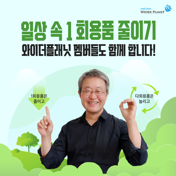 ㈜와이더플래닛이 1회용품 사용은 줄이고 다회용품 사용은 늘리자는 취지로 환경부에서 주관한 ‘1회용품 제로(1zer0) 챌린지’에 동참했다고 26일 밝혔다.