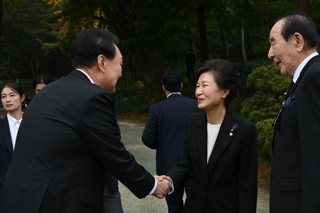 박정희 전 대통령 서거 제44주기 추도식에 참석한 윤석열 대통령과 박근혜 전 대통령이 26일 서울 동작구 국립서울현충원에서 박정희 전 대통령 묘소를 함께 참배한 뒤 헤어지며 악수하고 있다. 2023.10.26 [대통령실 제공. 재판매 및 DB 금지] [이미지출처=연합뉴스]