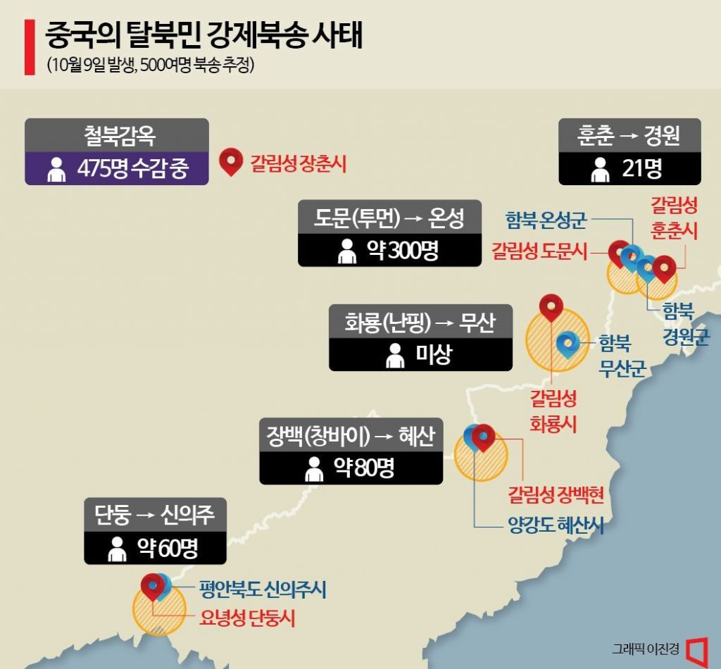 소식통은 "차량 행렬 앞뒤로 콘보이(호위 차량)가 위치했고, 무장 상태의 공안을 태운 차량이 뒤따랐다"며 "이동 수단을 제공하고 공안이 일대일 마크까지 붙어 북한으로 이송했다는 것은 중국이 북송에 적극적·조직적으로 개입했다는 증거"라고 지적했다.