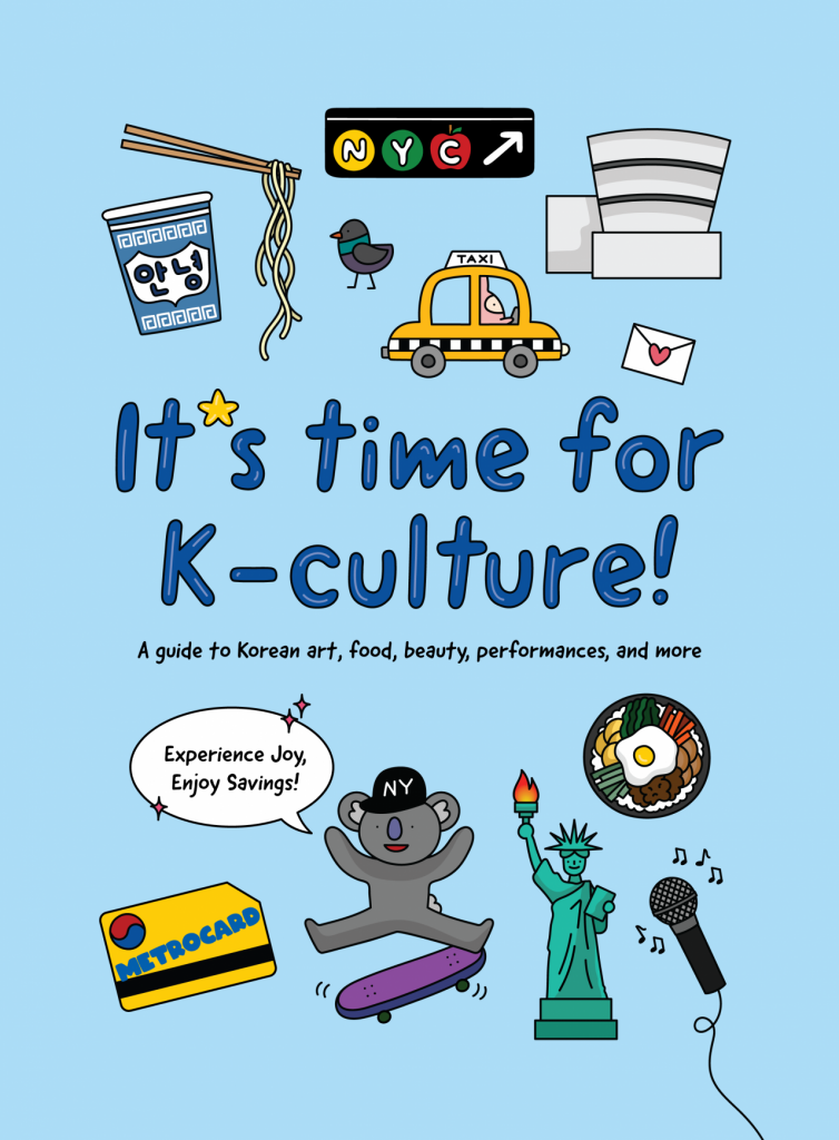 뉴욕한국문화원은 26일(현지시간) 맨해튼에서 간담회를 열고 오는 11~12월 뉴욕에서 열리는 K-컬쳐 행사 정보를 온·오프라인 지도로 정리해 배포하는 '잇츠 타임 포 K-컬쳐(It's Time for K-Culture)' 캠페인을 추진한다고 발표했다. 이번 캠페인은 뉴욕시가 후원하고 메트로폴리탄미술관을 비롯한 뉴욕 내 주요 미술관, 박물관, 공공도서관, 한국식당, 상점 등 52곳이 참여한다.