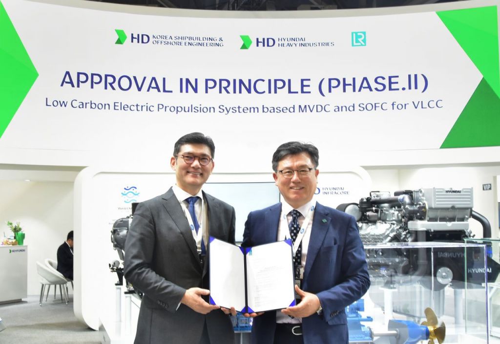 HD현대 조선 계열사인 HD한국조선해양과 HD현대중공업은 최근 영국 로이드선급(LR)으로부터 ‘고압직류전력계통(MVDC)과 대용량 연료전지(SOFC) 기반의 초대형원유운반선(VLCC)용 저탄소 전기추진시스템(Phase. II)’에 관한 기본설계인증(AIP)을 획득했다고 27일 밝혔다.